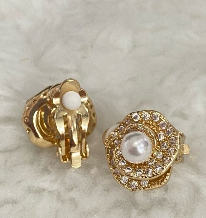 Brinco pressão clássico com pérola central e brilho sofisticado